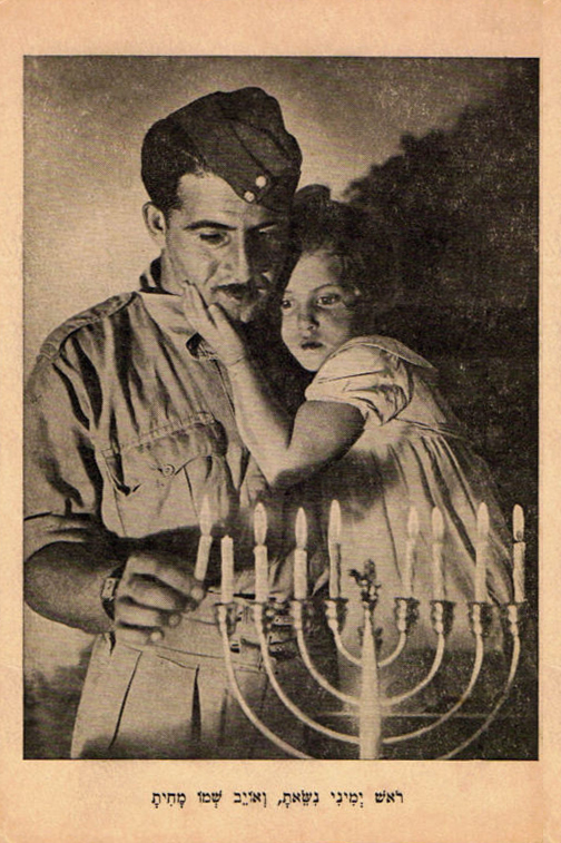 Another standout is a circa 1942 printed postcard featuring a photo of a girl holding onto her uniformed father, who served in WWII, and uniting to rejoice the miracle of Chanukah, as she looks into the light. The postcard features the eighth night, where he uses the Shamash (leading candle) to kindle the light upon all others. The front border and back is written in Hebrew, and the back notes the Jewish Soldiers Welfare Committee (founded 1917). The Hebrew translates as “Head of my right you lifted up, and the name of the enemy you obliterated.” The crest depicts a soldier with a Star of David, along with the Hebrew inscription, “The Yishuv (settlement) for the soldier.”