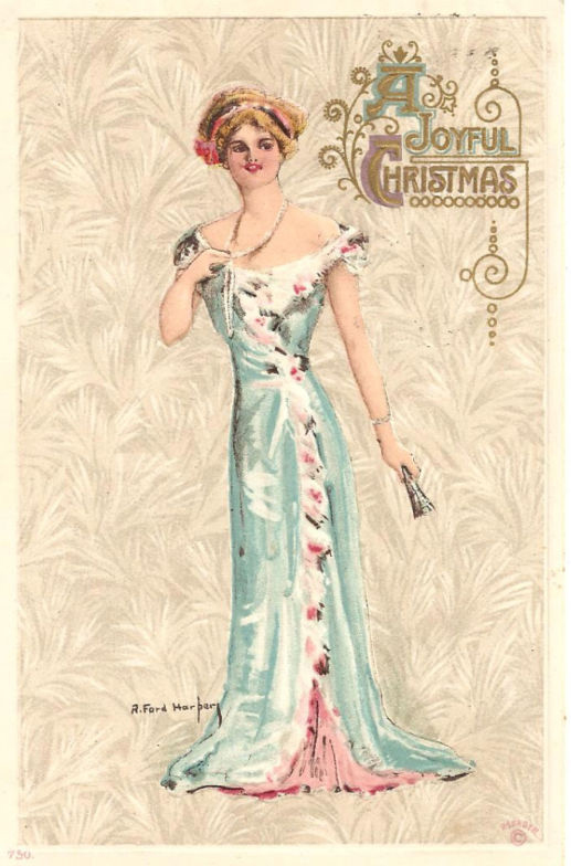 An artist signed postcard features an elegantly fashioned and beautiful woman who seems ready to attend a ball with her significant other. Artist Ruth Ford Harper (1883 – 1922), who would sign her illustrations “R. Ford Harper,” was acclaimed for her publication covers of “Harper’s Weekly,” “Good Housekeeping,” and New York Tribune’s “Sunday Magazine.” Another focus was book illustrations, including frontispieces. She was a New York City artist who later pursued her studies in Paris. “A Joyful Christmas” is inscribed in a very imaginative and regal Art Nouveau style, with an application of gold leaf.
