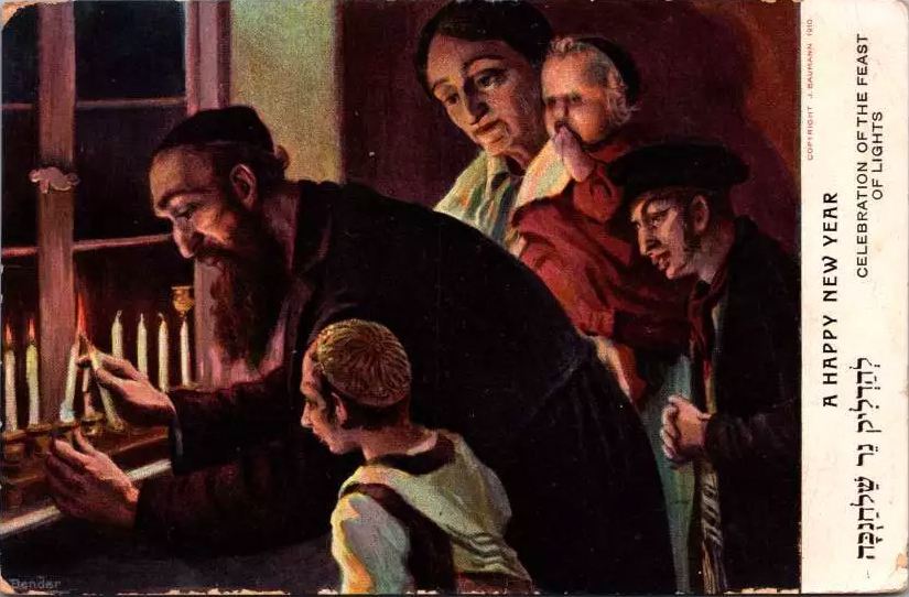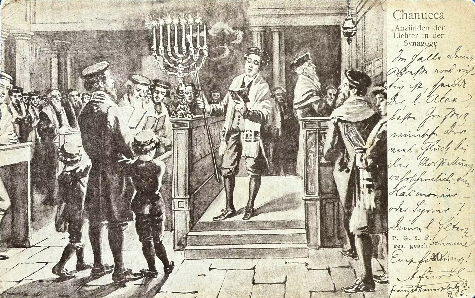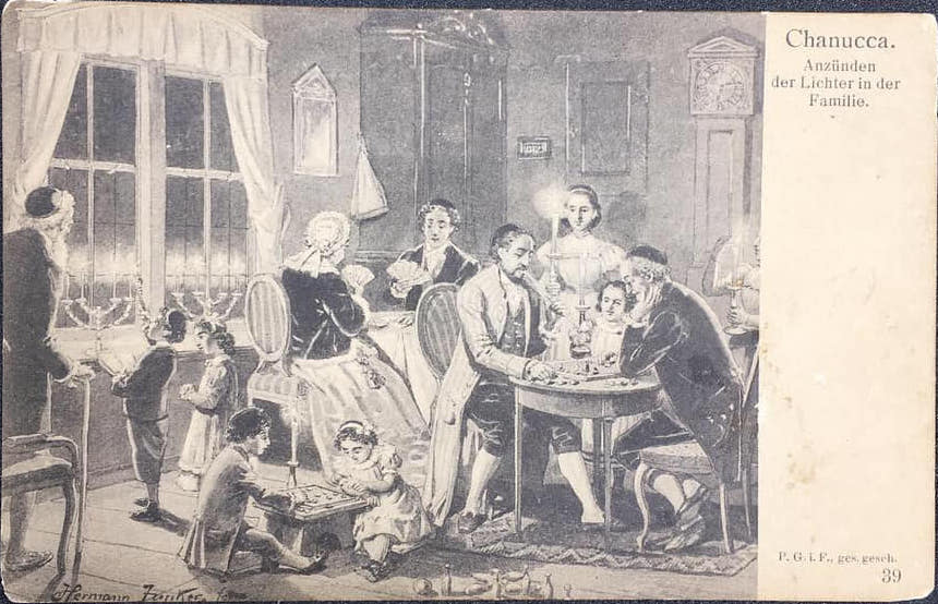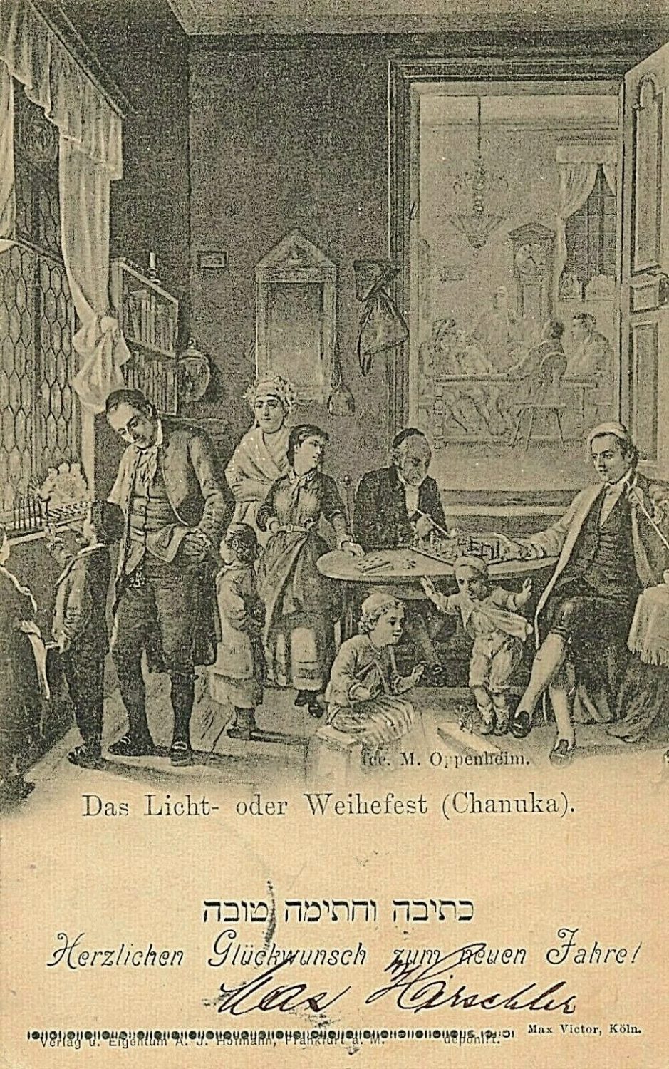 Chanukah postcards occasionally feature very much true to life drawings by notable artists, keeping traditions alive. The University of Chicago Special Collection Research Center consists of circa 1900 to 1907 German postcards from the Harry B. and Branka J. Sondheim Jewish Heritage Collection. A series of 57 postcards features Hermann Junker’s illustrated scenes, such as “Chanucca: The lighting of the candles in the family’s home.” “Anzünden der Lichter in der Synagoge” is German for “Lighting the candles in the synagogue.” “Das Licht oder Weihefest” is German for “The Light or Consecration Festival,” which is printed on a circa 1898 postcard. It was produced by German artist Max Victor, who specialized in exquisitely illustrated scenes alongside Hebrew and German text. He also focused on Passover and Rosh Hashanah postcards from a Cologne, Germany publishing house. All three postcards establish a theme of unity and light in the synagogue with G-D, and at home among a large multi-generational family that is also playing games.