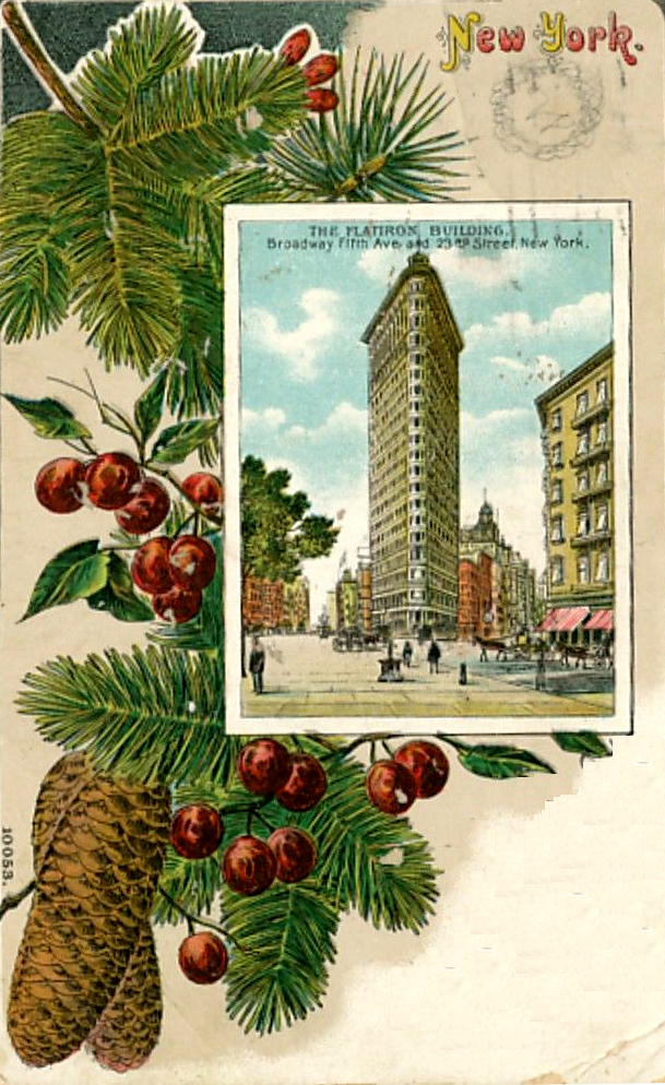 Another Christmas postcard celebrates an architectural marvel, the Flatiron Building, architect Daniel Burnham’s Renaissance palazzo showcasing the Beaux-Arts style. Completed in 1902, it became one of Manhattan’s earliest and most uniquely shaped skyscrapers and the first steel skeleton structure. This postcard can also establish a timeframe of its publication, since the adjacent Fifth Avenue Hotel stood from 1859 until 1908. It became the social, cultural, and political center of elite New York, so the recipient may wonder, “What better way to spend Christmas?” This postcard uniquely features a postcard within a postcard, where holly and pine cones add a backdrop of gracefulness to the scene.