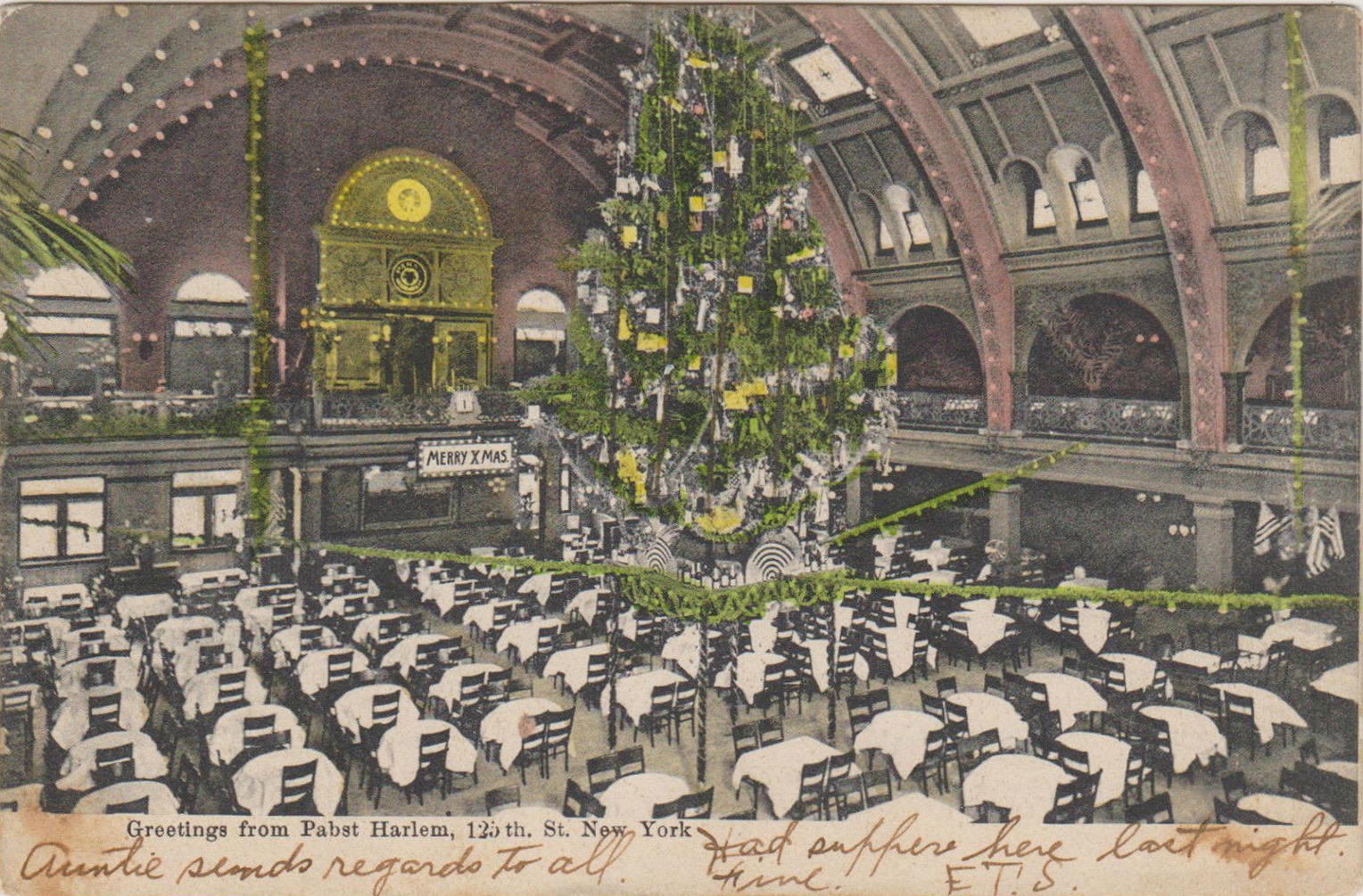 Some hand-colored postcards capture landmarks of the era, where some are officially designated today. Pabst Harlem Music Hall & Restaurant at 243 West 124th Street opened in 1900 and became America’s largest restaurant, with 1,400 seats with a balcony under a huge barrel roof. A large, lavishly decorated Christmas tree extended the height.