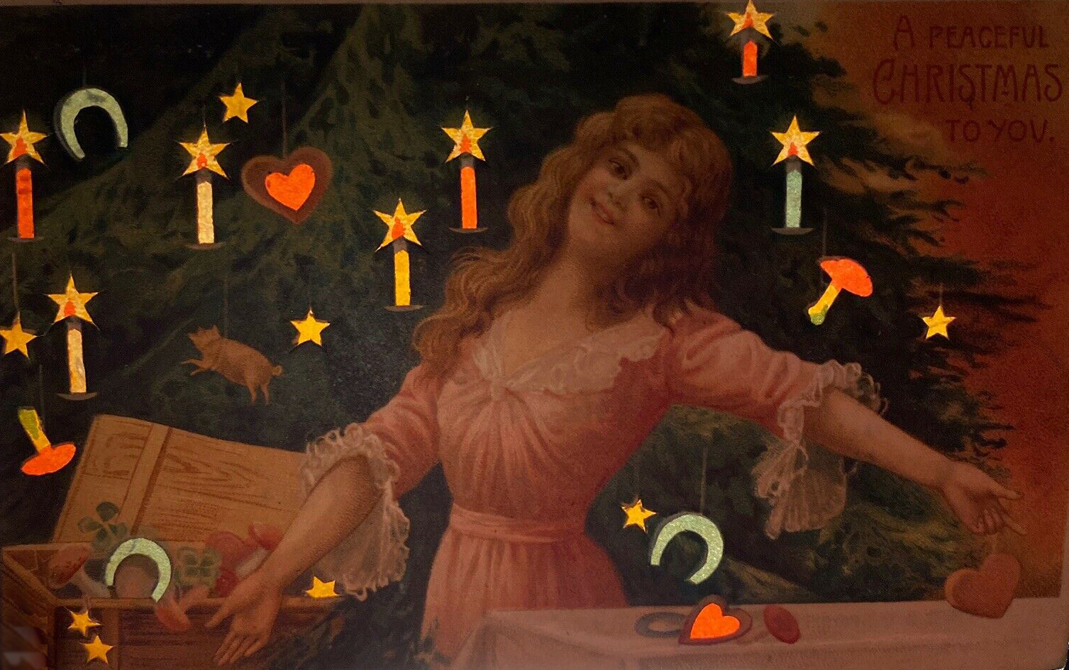 Christmas postcards, initially published in Germany and Holland prior to the trade coming to America, were produced in significantly large quantities. Novelty postcards are masters of engineering, as in hold-to-the-light (HTL) postcards that fulfill its function after nearly 120 years. A circa 1906 postcard features an elegant young woman extending her arms, as if to embrace her significant other in front of a Christmas tree. “A peaceful Christmas to you” is inscribed. A wooden chest contains ornaments that she is decorating her tree with. As it is held up to a light source, the entire card changes color, and the ornaments become most vibrant.