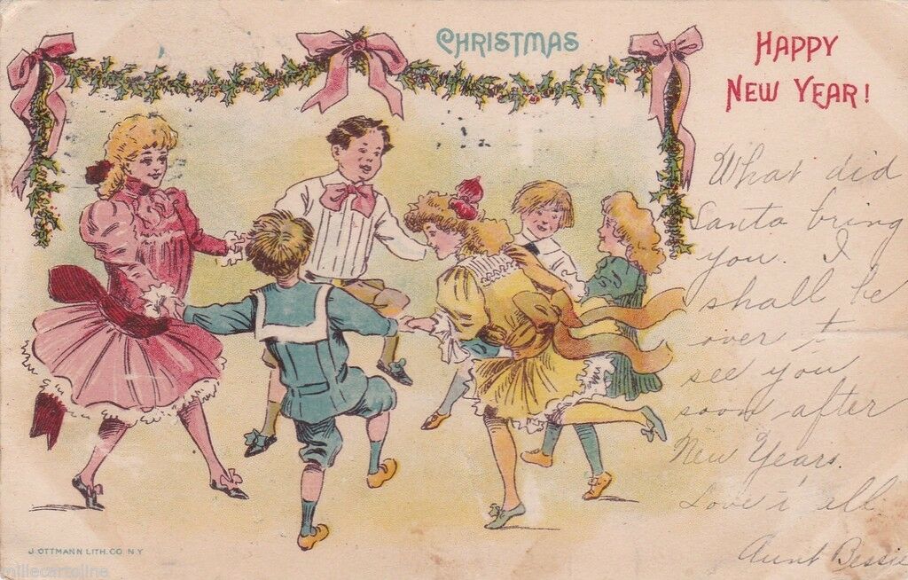 J. Ottmann Lithographing Co. of New York produced an illustrated circa 1905 postcard of a family holding hands and cherishing holiday joy as they dance in a circle. Printed calligraphy transitions between Christmas and New Year’s, and also evident is how some postcards feature personal greetings in the front. The fine script from Aunt Bessie read: “What did Santa bring you? I shall be over to see you soon after New Year’s. Love to all.”