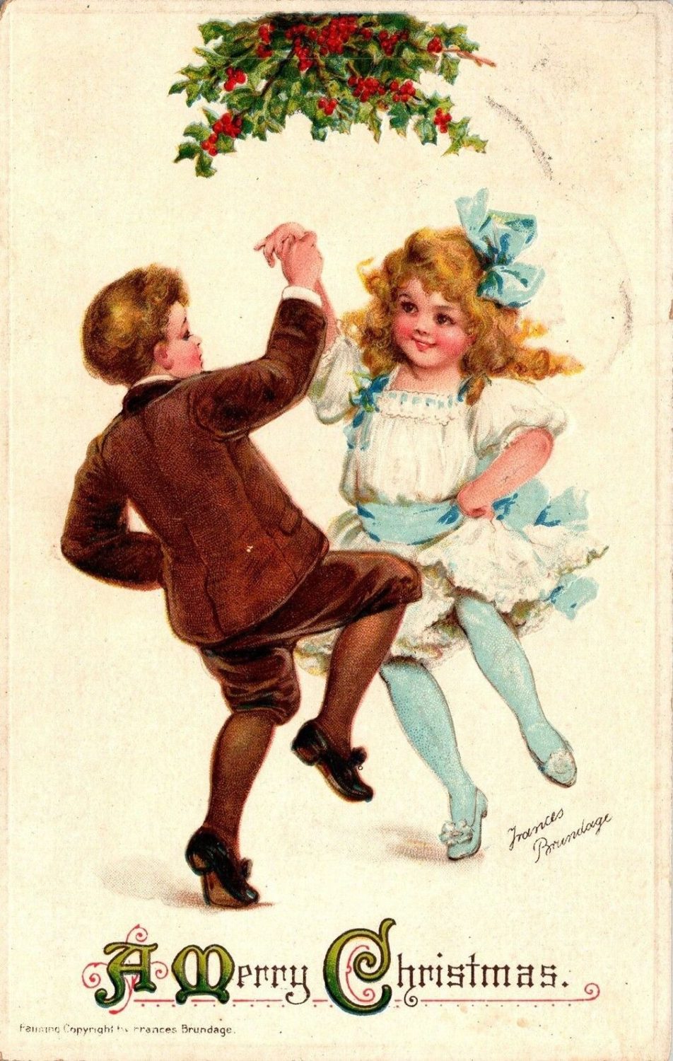 Victorian Children dressed in elegant traditional attire and having the time of their life, can be found on early 20th century postcards. A standout is a circa 1914 artist signed postcard by Newark, New Jersey native Frances Brundage (1854 – 1937), where a boy and girl are dancing under the mistletoe. She was an acclaimed American illustrator, specializing in depicting children on postcards, calendars, and ephemera published by Saalfield Publishing, the foremost Raphael Tuck & Sons, and Samuel Gabriel Company. She also illustrated numerous books for firms including Fiske & Company and Stecher Lithographic Company.
