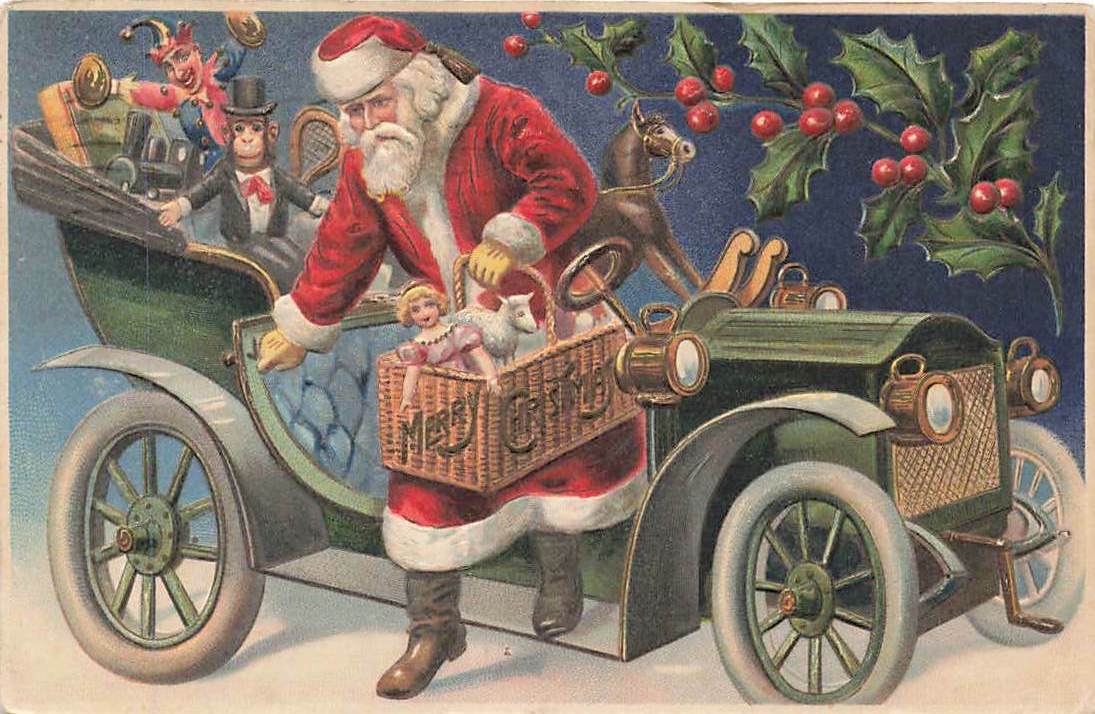 Some early 20th century postcards were highly imaginative and celebrated the early years of technology. One case is a circa 1909 postcard, where Santa Claus delivered gifts not on a magic sleigh with eight flying reindeer, but by hopping out of an automobile with a basket. In 1866, just over a few decades prior, Karl Benz was accredited with inventing the motorwagen, a modern automobile that featured three wheels. Santa’s helpers seemingly take the form of a monkey donning a top hat and a wide-grinned clown with cymbals. A rocking horse, a doll, tennis racket, and a locomotive are among the gifts that children found most desirable.