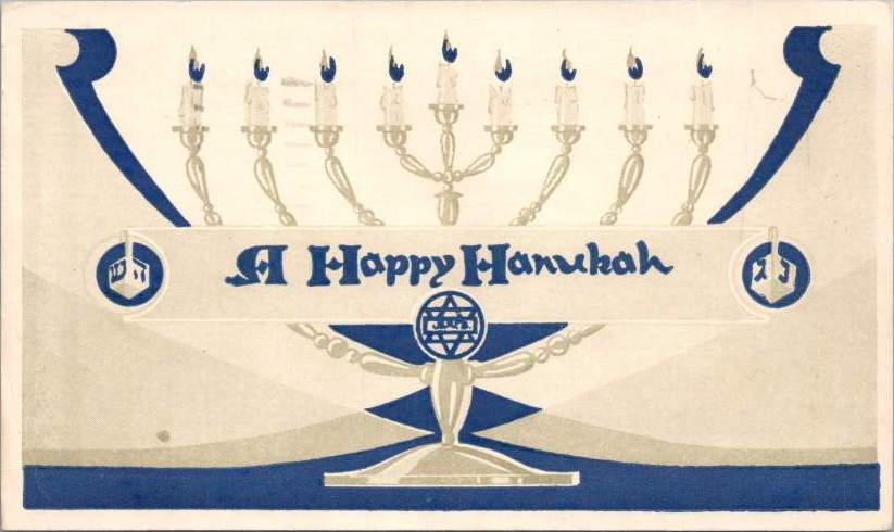 It may be surprising to find that few Chanukah postcards were published, which is a result of a relatively more recent tradition of mailing Chanukah cards versus Rosh Hashanah postcards. The majority of Chanukah postcards are from the 1940s and 1950s, published in response to WWII, but a few were published in the early 20th century. One standout was produced by USO (United Service Organizations), where the acronym was stamped on the back within a crest. The front features an illustrated menorah with dreidels in a subdued gold, navy blue, and white, which is associated with traditional colors of Judaism. The overall design is Art Nouveau.