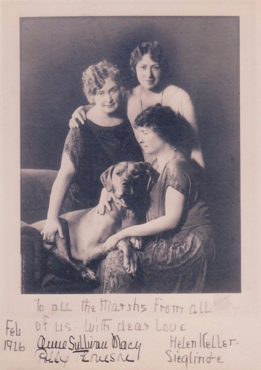 Helen Keller & dog Sieglinde in bottom row, Anne Sullivan Macy & Polly Thomson in top row. Courtesy of the Hof family.