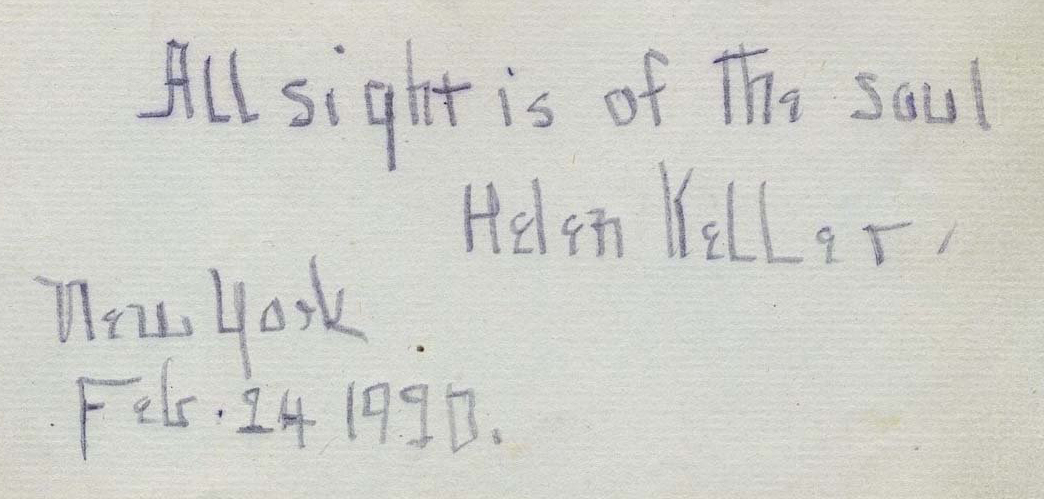 Helen Keller quote and signature, February 24, 1920.