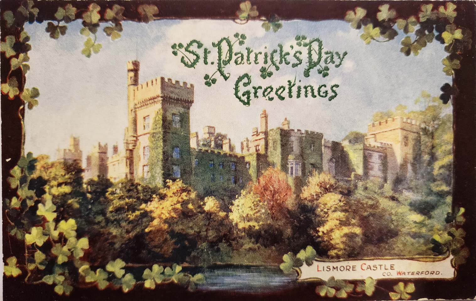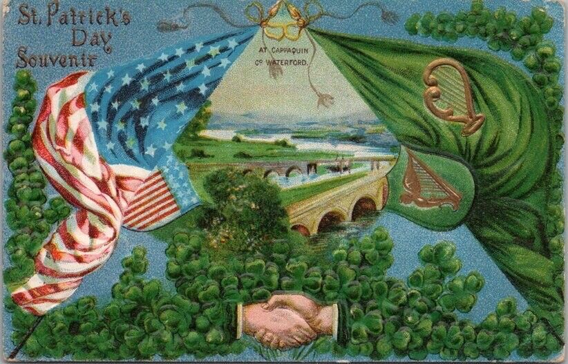 Scenery featuring bodies of water, bridges, and castles commonly appear on St. Patrick’s Day postcards, reminiscent of an Irish immigrant’s home country. An illustrious circa 1912 “St. Patrick’s Day Souvenir” reinforces the bond between America and Ireland with a handshake between a lush assemblage of shamrocks and American and Irish flags and crests, forming a banner that surrounds Cappaquin Co. Waterford, Ireland. It highlights Munster Blackwater, a river flowing through Kerry, Cork, and Waterford, and consisting of at least 27 bridges.