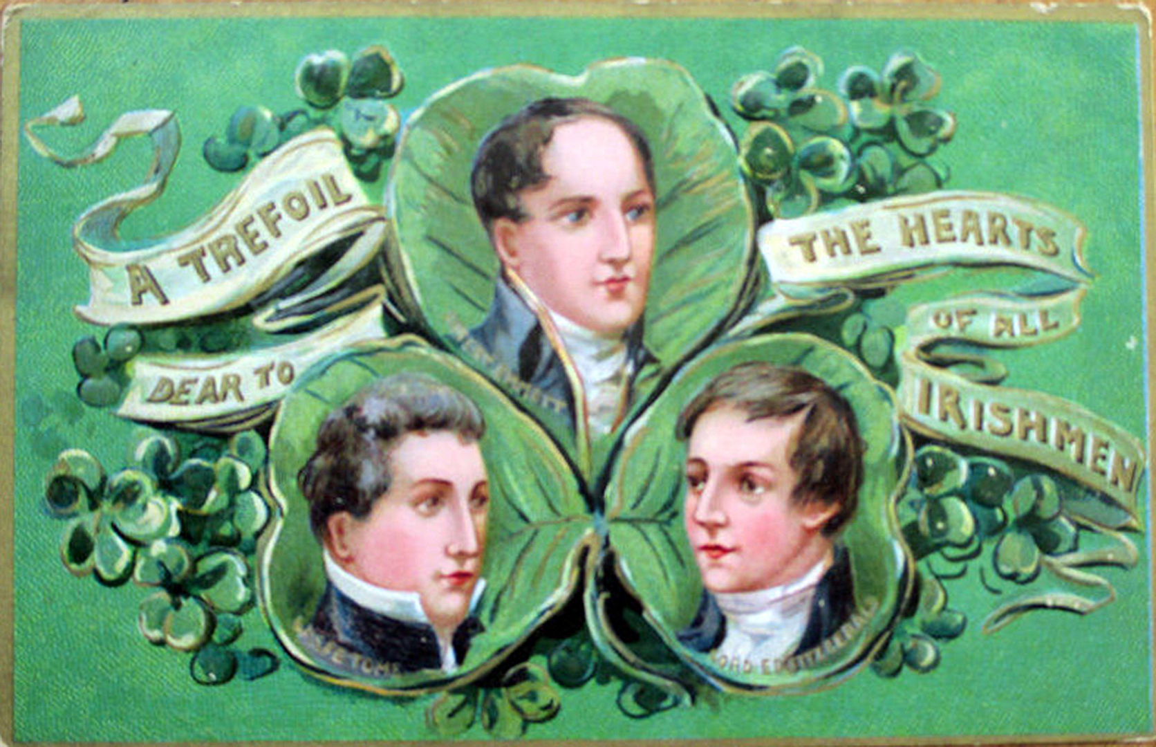 Irish heroes must not be forgotten. Such is the case with a circa 1909 postcard by Raphael Tuck & Sons, Series No. 157 “The Emerald Isle.” Lord Edward Fitzgerald (1763 – 1798), Robert Emmet (1778 – 1803), and Wolfe Tone (1763 – 1798) are depicted in an ornate shamrock, accompanied by ribbon and smaller clovers. Their names are embossed in gold leaf. Fitzgerald was an Irish nationalist and aristocrat known for his gallantry, and as a leading conspirator of the United Irish Rebellion of 1798. Emmet is remembered as an Irish nationalist patriot, Irish Republican, and an orator who led rebellion against British rule in 1803. His speech from the dock is largely quoted. Tone was a leading Irish revolutionary figure and a founder of the United Irishmen, which revolted against British rule in Ireland.