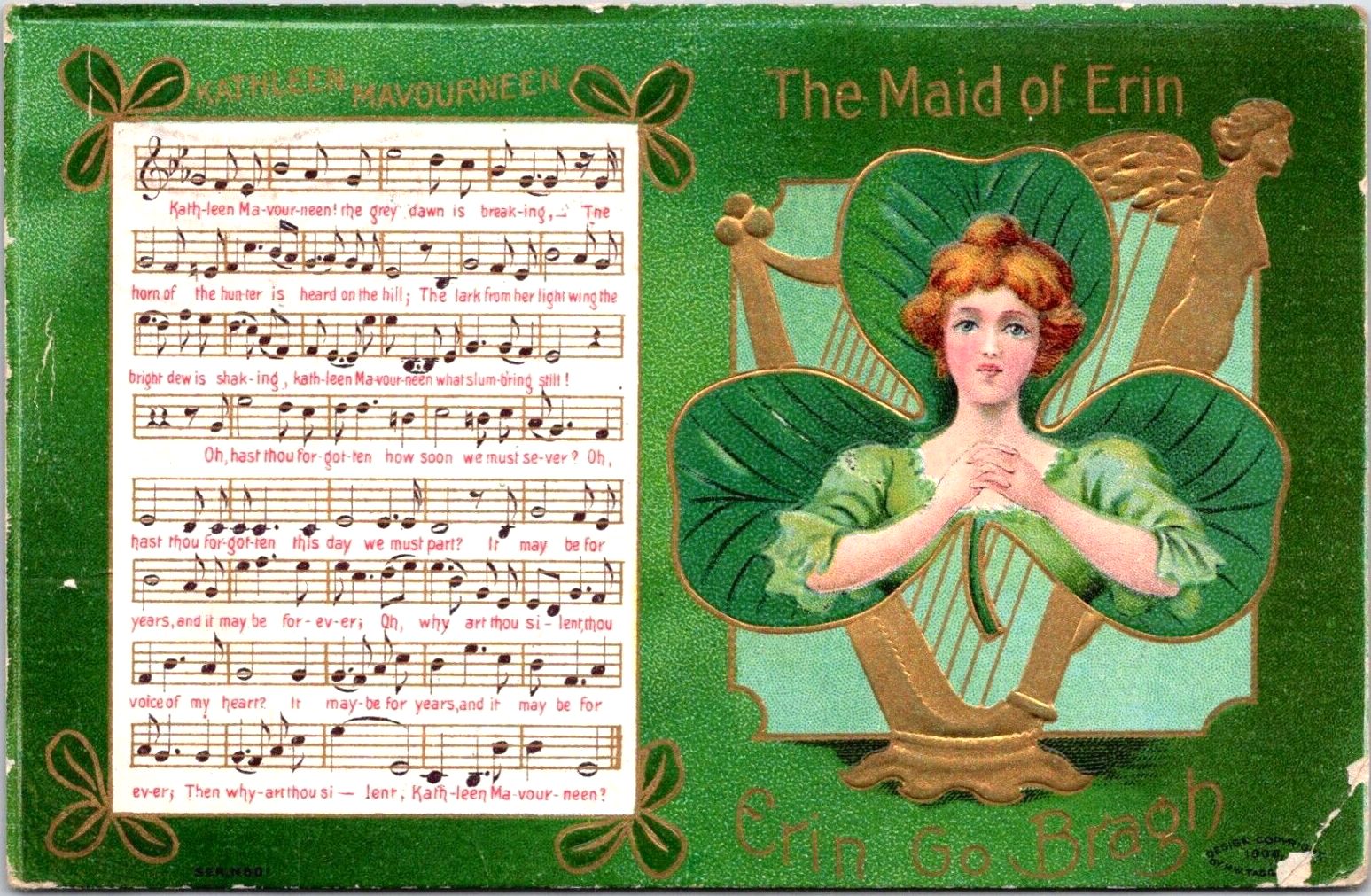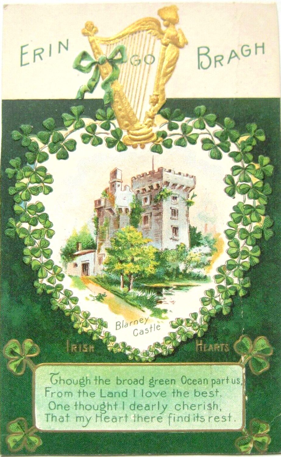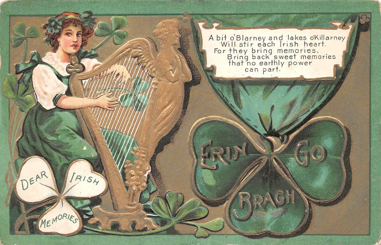 A heavily embossed and multi-dimensional varied green and gold poetic postcard features a woman playing traditional St. Patrick’s Day music on a harp, evoking “dear Irish memories,” which cannot be fragmented by scientific force. Blarney and lakes O’Killarney are deeply rooted with tradition. The internationally acclaimed lakes in County Kerry consist of Upper Lake, Muckross Lake, and Lough Leane.