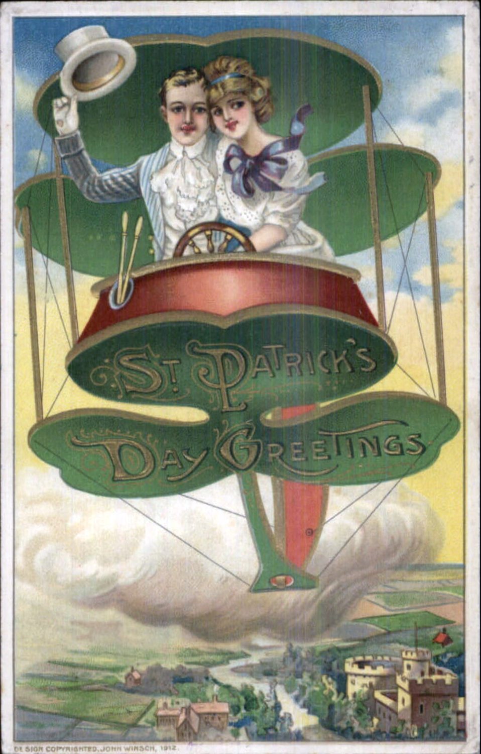 Prominent artist John Winsch (1865 – 1923) of Stapleton, New York, applied his touch to St. Patrick’s Day postcards. He was co-manager of Art Lithographic Publishing Company. Many of his cards were published in sets, and he produced approximately 4,000 designs between 1910 and 1915. He was highly recognized for his holiday themes and his use of European artists who worked with his German printers. A shamrock, which is Ireland’s national emblem, appears on a 1912 John Winsch postcard where an elegantly appointed couple uses a steering wheel to operate its inspiration for a hot air balloon. An aerial view captures a castle and the Emerald Isle theme of Ireland due to its rolling green hills. This postcard is Victorian yet innovative, since an imaginative approach and technological forms of transportation was embraced in the early 20th century.