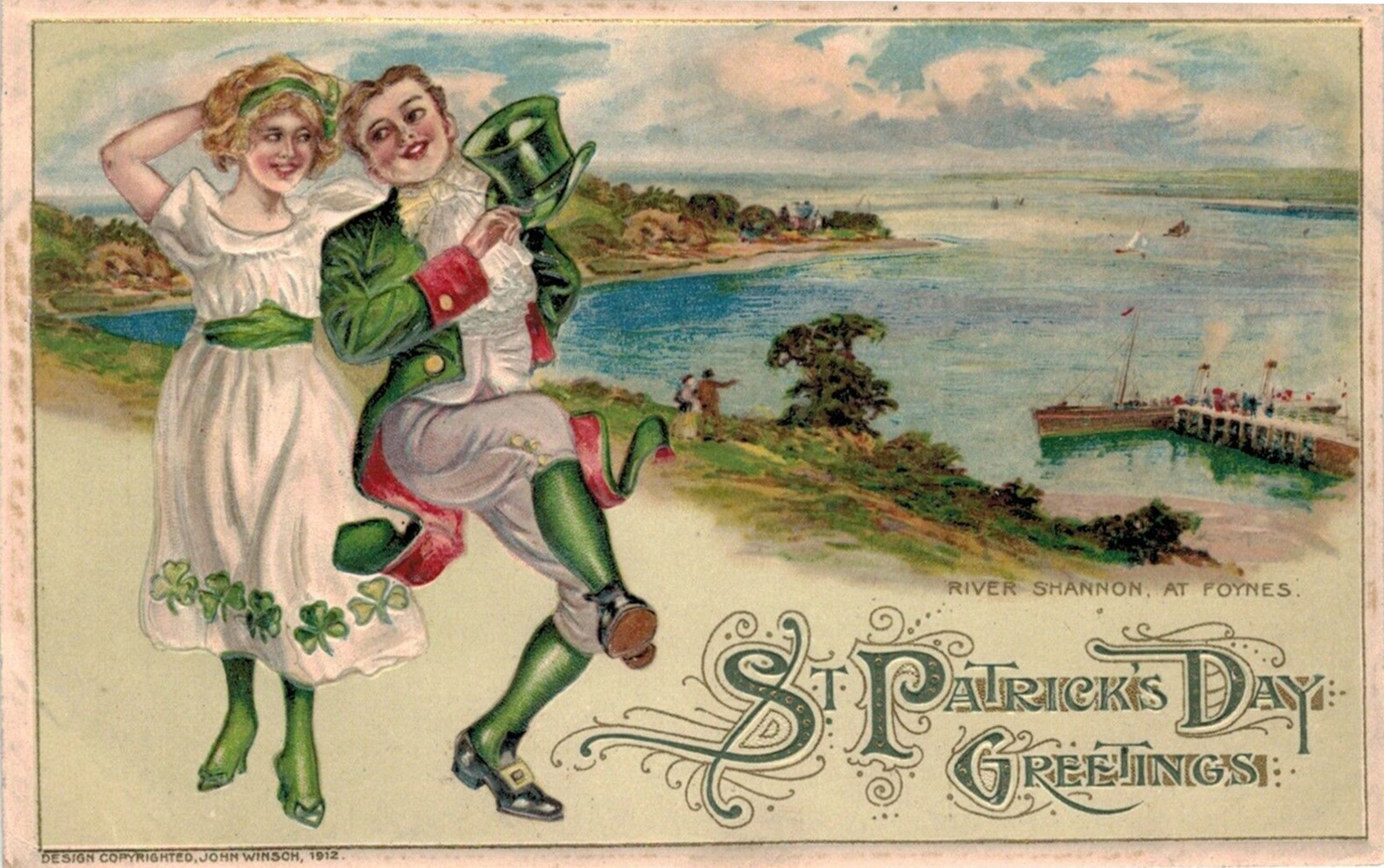 A jovial and romantic couple is brilliantly captured in traditional St. Patrick’s Day attire in another 1912 John Winsch postcard, as they stand adjacent to the banks of the majestic River Shannon at a village known as Foynes. Spanning 240 miles, it is the British Isles’ largest river. Elaborate deep green and gold intricate calligraphy greets the postcard recipient, and signifies how designing postcards was a labor of love.