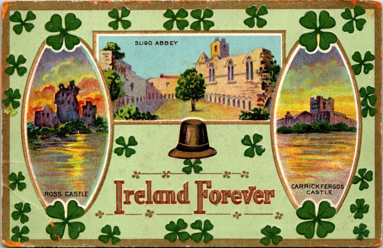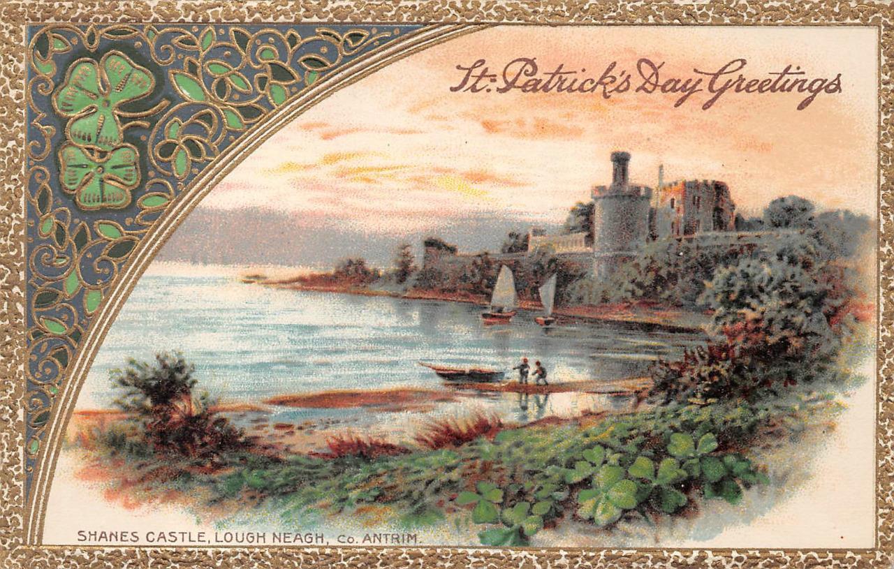 A modern-day collector or an early 20th century recipient feels like jumping into the watercolor inspired lithographs, as in the case of a scenic view of Shane’s Castle. It is framed by an ornate gold, blue, and green window-like border, graced with bright green shamrocks and alternating green leafy motifs. This ruinous castle is located on the northeast shores of Lough Neagh near Antrim in Northern Ireland, and was erected in 1345. Its name originated after Shane McBrian McPhelim O’Neill, ruler of Lower Clandeboy from 1595 to 1617.