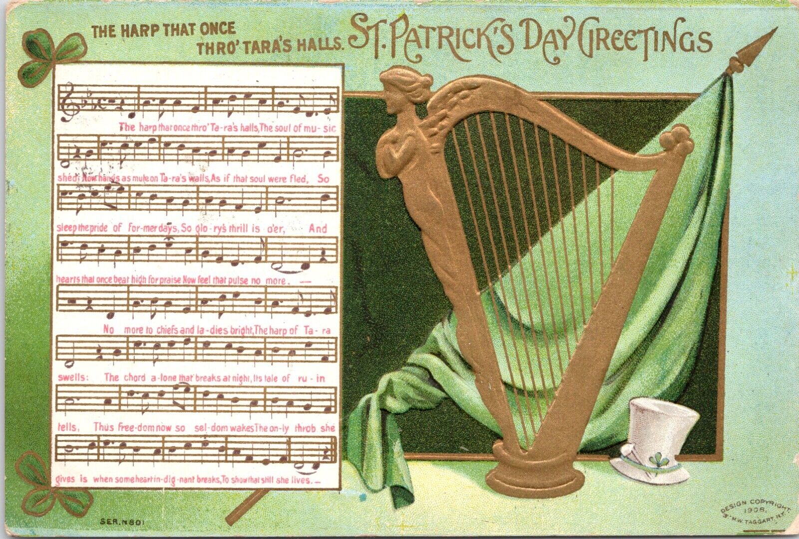 Another exceptional postcard that presents a musical score enables current generations to play classics, such as “The Harp That Once Thro’ Tara’s Halls.” This design was copyrighted in 1908 by M.W. Taggart, a New York City-based firm from 1905 to 1910, whose specialty was holiday and greeting postcards. The song was published in 1875 by the Poet’s Box in Glasgow and composed by Irish poet and barrister Thomas Moore (1779 – 1852). In Co. Meath is a mysterious hilltop known as Tara, where Irish high kings resided. Early ballads originated from folk culture and predated printing, but many have been preserved as a result of being recorded on broadsides.