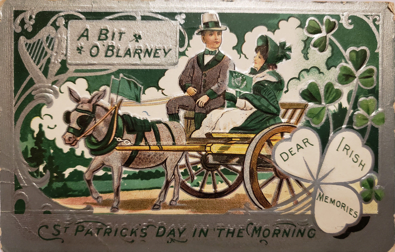 St. Patrick Series -2- features an ornate and heavily embossed Art Nouveau postcard of a couple on a horse and buggy, who are cherishing the morning’s beauty while admiring one another. The style of symbolic shamrocks and a harp tie into this circa 1909 postcard’s splendor.