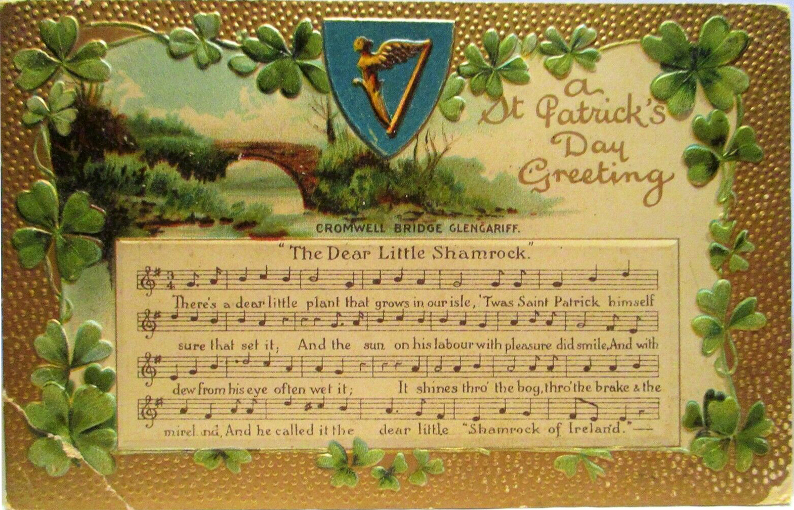A circa 1910 festive embossed postcard is part of the B.B. London & New York Series 1603, and was printed in Germany. “The Dear Little Shamrock” is one of many songs that a deltiologist can play to honor the holiday, which also shows how a postcard collector can further embark upon a journey by collecting music scores. This song was written by English composer, pianist, and music teacher John William Cherry (1824 – 1889) and published by W.A. Evans & Bro. in 1871. An educational experience unfolds, as Cromwell Bridge in Glengarriff is depicted in dream-like lithographic woodlands. This seaside village in West Cork features ancient woods, lakes, and rugged mountains. The bridge’s name is suggestive of “crom choill,” an Irish term meaning “sloping wood.” It could also represent “Currach An Mhaoilinn,” which is a bare flat-topped marsh. David Myler of the Facebook page Walking with Stones, suggested that it is derived from “croimeal” or “moustache,” pertaining to the archways’ configuration.
